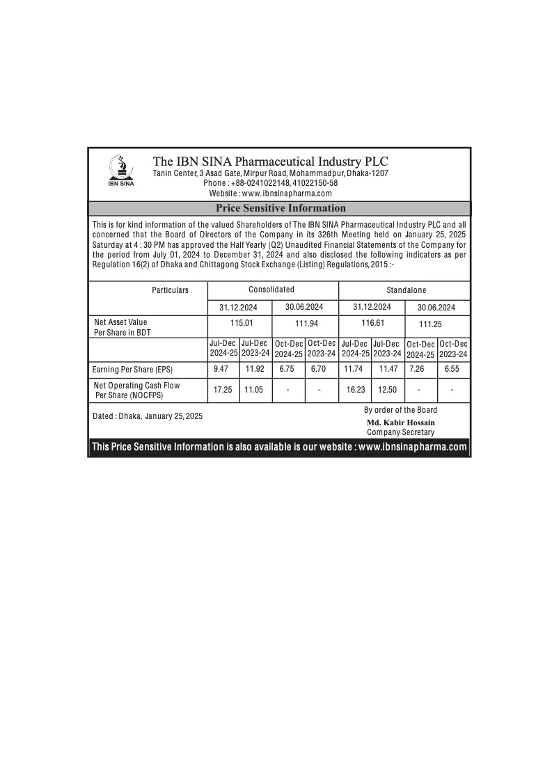 The IBN SINA Pharmaceutical Industry PLC Price Sensitive Information
